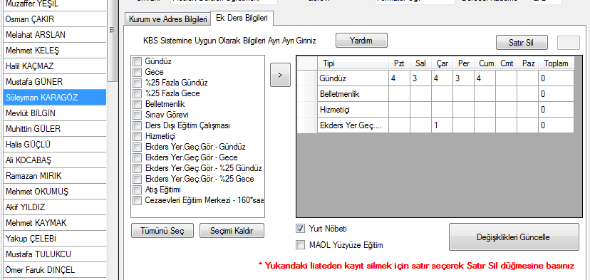 KBS Ek Ders Tiplerini Ayarlama Ekranı